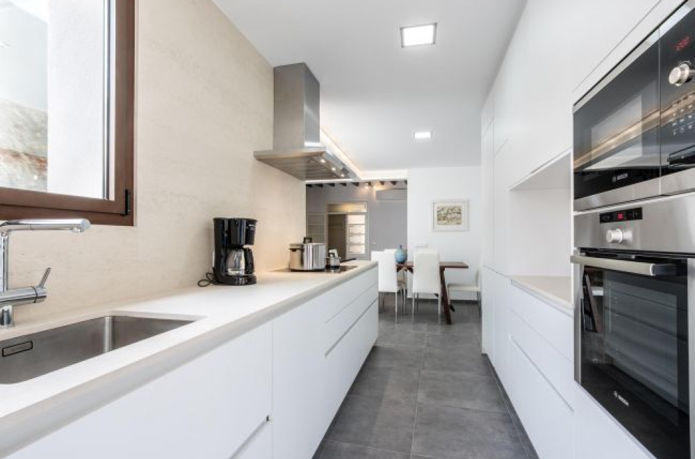 Der großzügige Lebensraum des Hauses verteilt sich auf zwei Etagen. Im Erdgeschoß befindet sich der großzügige Wohnbereich mit einer hochmodernen offenen Küche und ein Badezimmer mit Dusche. Das Highlight ist jedoch der moderne Innenhof mit einem bezaubernden kleinen Pool und einer Außenküche mit Grillbereich.