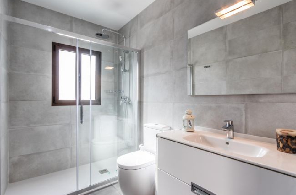Im Obergeschoß befinden sich ein Schlafzimmer mit Doppelbett und eigenem Bad und zwei weitere Schlafzimmer mit Einzelbetten, die sich ein hübsches Badezimmer mit Dusche teilen. Alle Schlafräume haben Einbauschränke und sind mit einer Klimaanlage ausgestattet. Auf der oberen Etage befindet sich zudem ein Waschraum und der Ausgang zu einer schönen Dachterrasse.